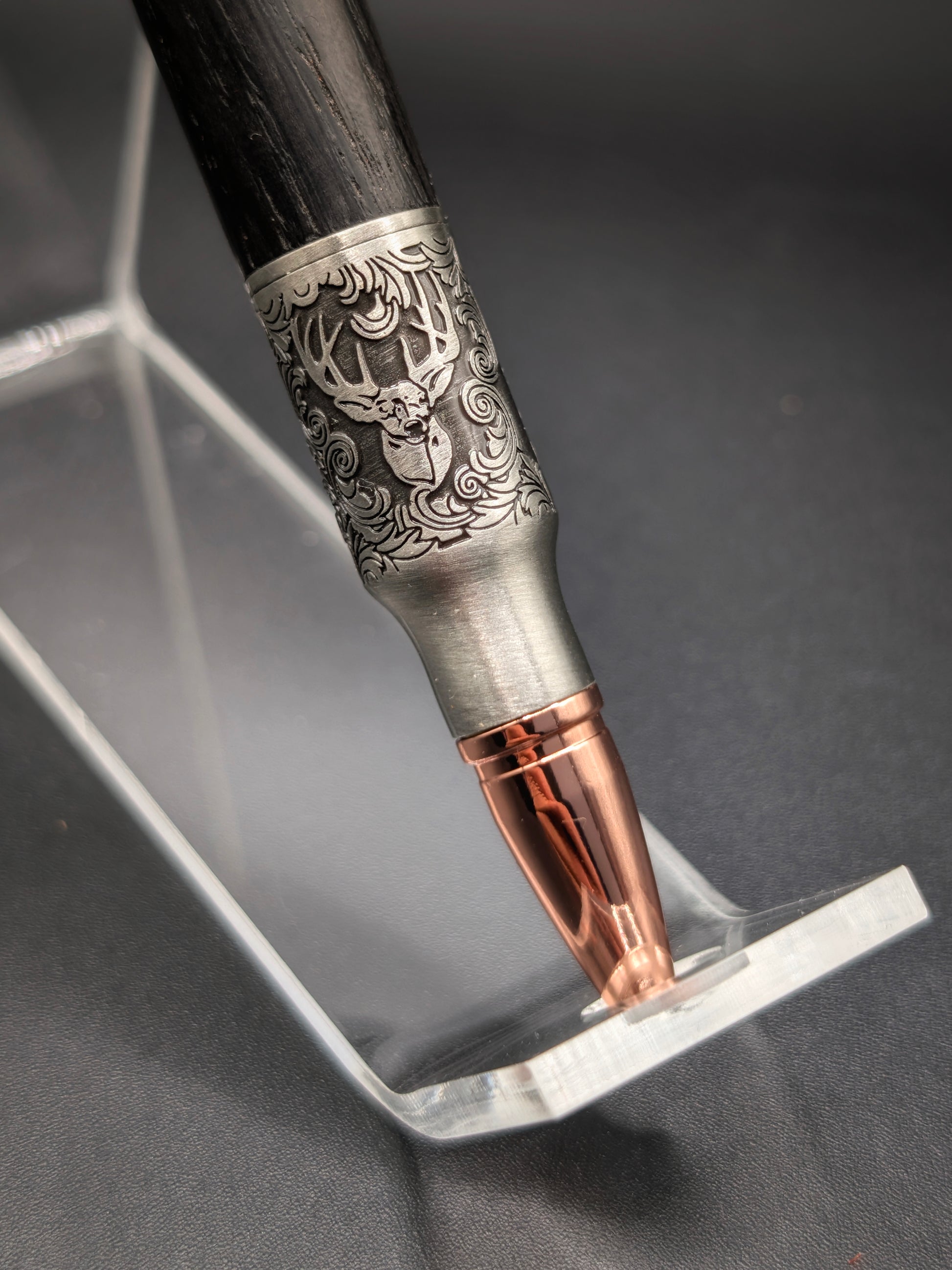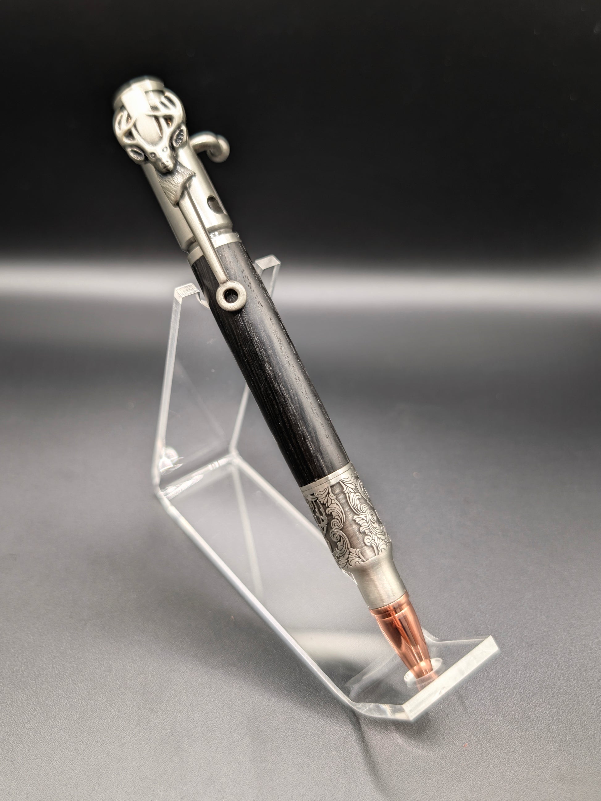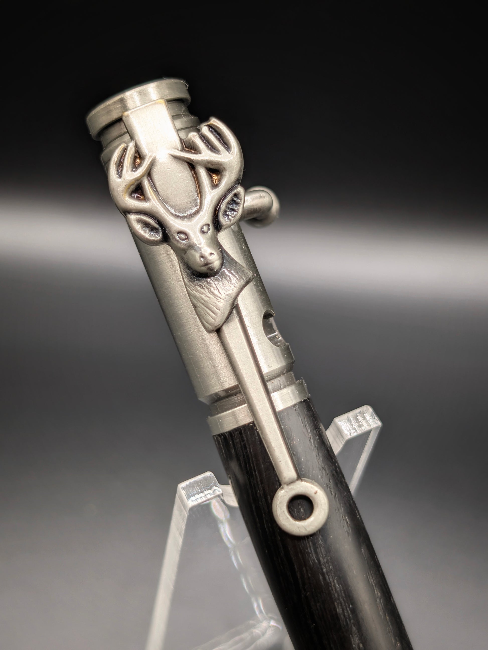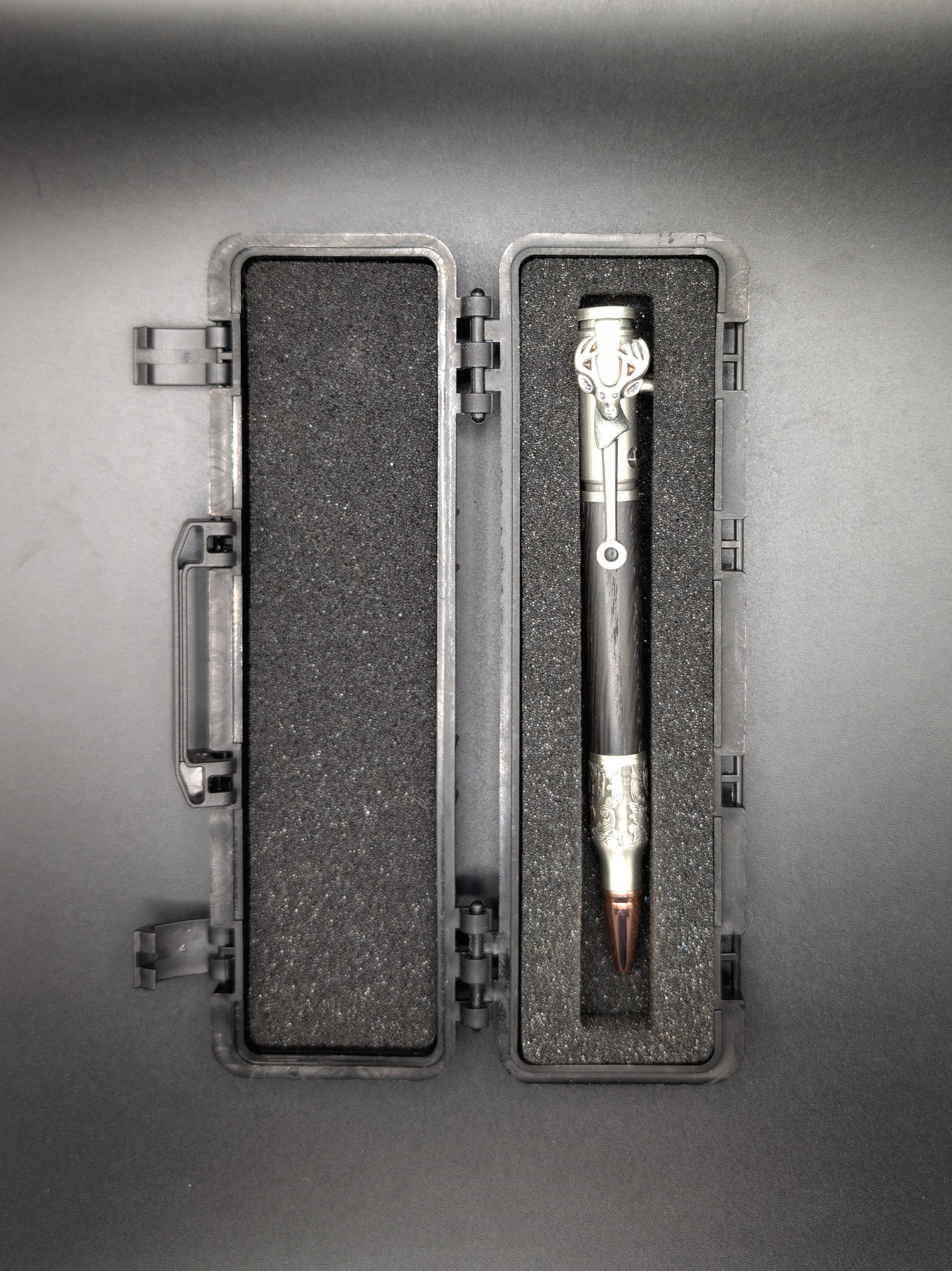 Le stylo chevreuil est un must pour les chasseurs. Avec sa finesse et son détail précis, il est fabriqué à partir de chêne de tourbière d'Ukraine daté de plus de 4500 ans. Cela en fait une pièce unique et luxueuse. Le stylo vient dans son propre étui, rappelant un coffre d'arme, ajoutant un aspect exclusif à cet objet de collection.